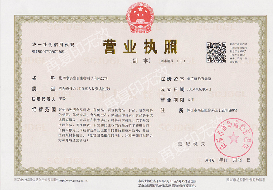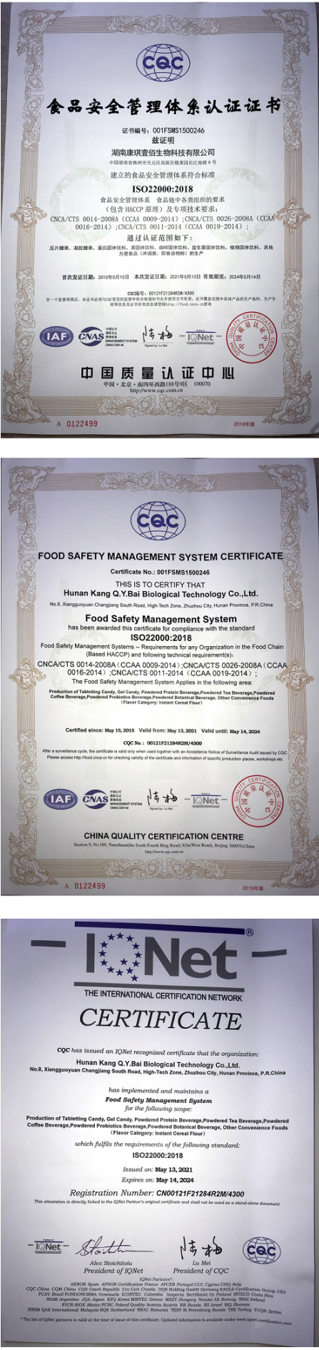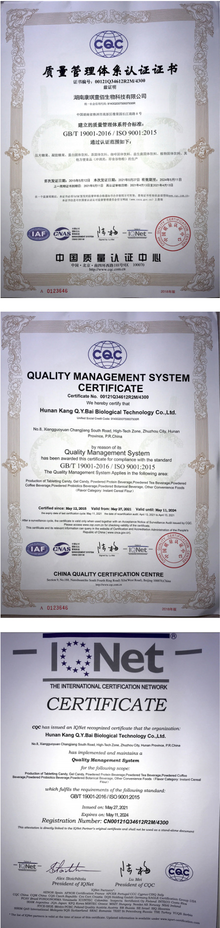 Hunan Kangqi Yibai Biotechnology Co., Ltd. was established in June, 2003. The company is committed to researching, producing and selling a series of functional health foods, including health foods, fortified foods and other health foods. It is a comprehensive enterprise with high-tech characteristics. The production scope covers soft capsules, tablets, candy products, substitute tea, solid drinks, liquids and other dosage forms. It has 34 national approvals and has a good reputation in the industry.